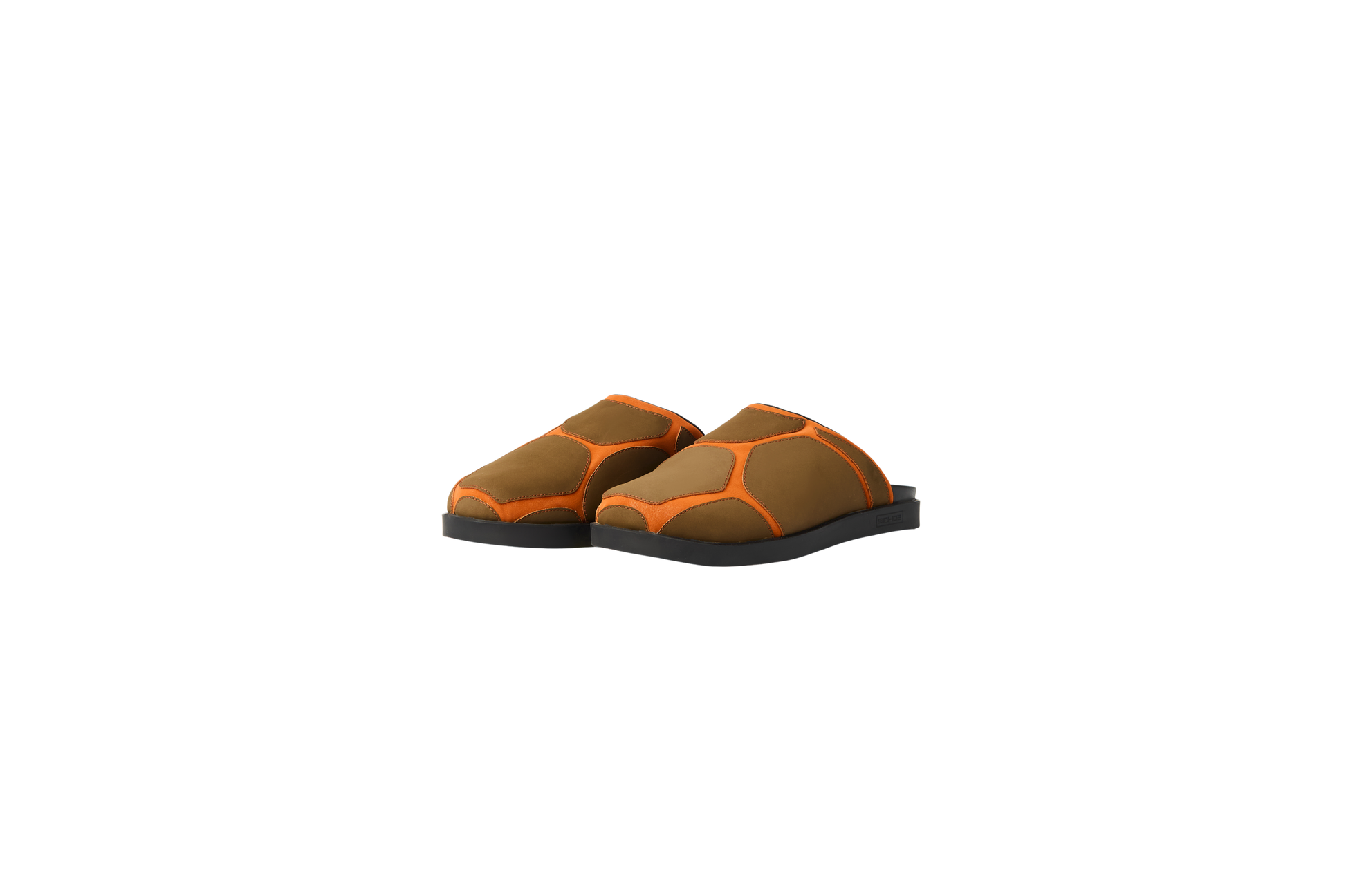 Olive suede upper panels. Burnt orange leather base and frame. Tonal stitching. Dual-material construction throughout.